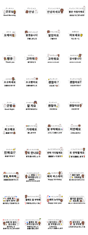 韓国語と日本語の吹き出しスタンプ。ふりがな カタカナ(ルビ)付き。よく使う言葉、年上の方にも使いやすい敬語入り:)イベント 誕生日 お正月 あけおめ 挨拶 先輩 日韓 友達 ※BROWN & FRIENDS をみんなでつくろう!キャンペーン参加スタンプですyellow23 より発売