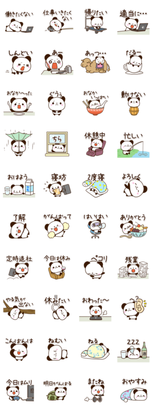 ちいさいパンダの、暑くて、だるいとき、仕事が面倒なときに使えるスタンプ。基本的な言葉やよく使うあいさつ等を集めました。かわいいぱんだが好きな方にぜひ。【かたこ】