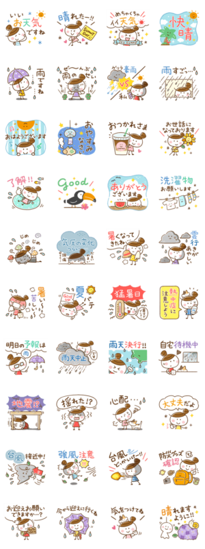 梅雨から夏・台風シーズンに使えるお天気スタンプです♪ 生活ってお天気に左右されますよね…。 雨の日も晴れの日も元気に過ごせますように! 日常会話入り♪アトリエムース より発売