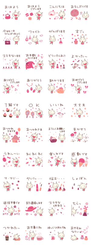 どちウサ。大人ガーリー編。「了解です」「大丈夫」から「ステキな一日を」まで。キュートなどちウサで、品よくメッセージをデザインしよう。家族、学校、お仕事でも。