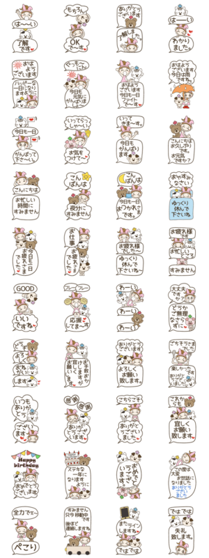 ポニーテールの大人女子、ウサギおちゃめと仲間達(猫・犬・くま・ぶたさん)吹き出しのBIGな長文敬語です。毎日使えるメッセージ、挨拶、返事、お祝い、誕生日、応援など