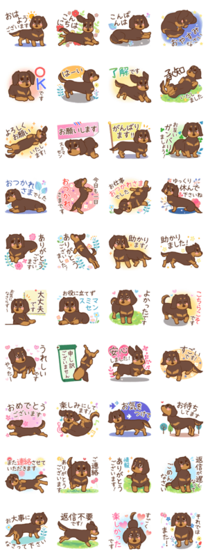 落ちついた大人可愛いダックスフンドのスタンプです。よく使う日常会話敬語が満載!