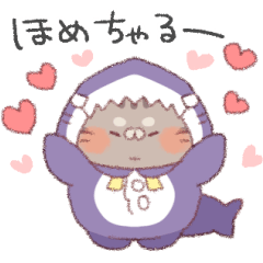 サメの着ぐるみを着たにゃんこスタンプです。褒めたり、励ましたりしちゃる!駄菓子屋 より発売
