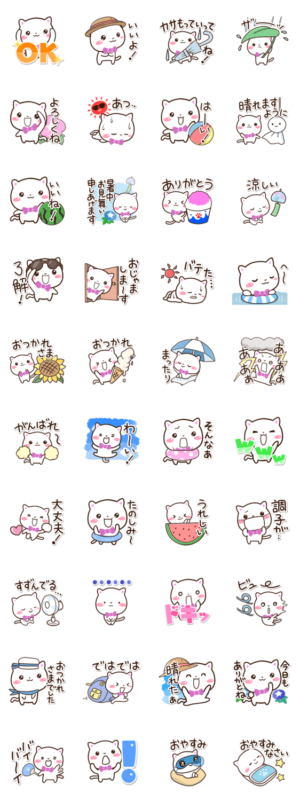 白猫ちゃんと夏をテーマにした作品。全体的にLINEスタンプとして優秀な仕上がりで、ケチをつけるべき点がほぼほぼない。