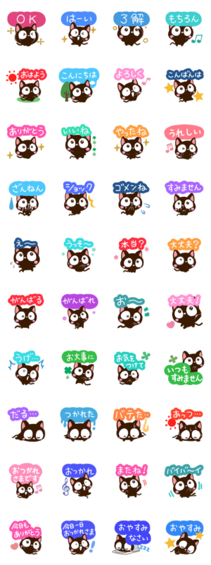 『小さい黒猫スタンプ』のカラフルなスタンプです。夏色で明るく目立つ、クロネコスタンプです。くろねこ好きな方に、絵文字と合わせてぜひ。【かたこ】