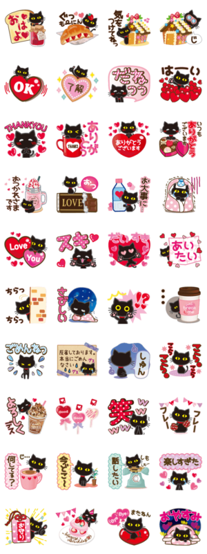 ハートがたくさんの黒猫ラブラブスタンプです♥日常の挨拶や愛の言葉にたくさんのハートを添えて♥彼氏(恋人)や旦那さんがいる人もいない人も家族友達に送りましょっ♥紅おれんじ より発売