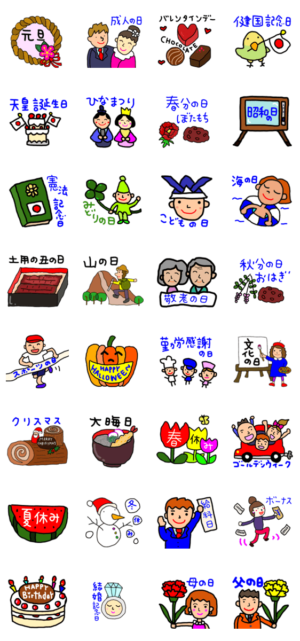 祝日や記念日のスタンプ。元旦、成人の日、バレンタイン、春分の日、秋分の日、結婚記念日、誕生日などyunyun より発売