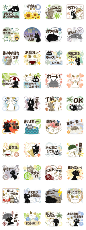 黒ねこちゃん達とみけさんのコラボ日常スタンプ 夏編です!まちゃの部屋 より発売
