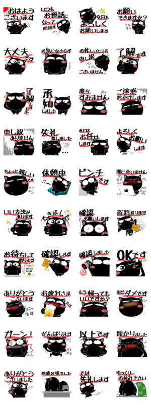 黒猫の社会人向けのデカ文字スタンプ。毎日よく使う言葉がたくさん。朝から晩まで使えます。やさしい言葉、厳しい言葉、敬語もあるよ。猫、ネコ、ねこ。猫好きの方へ。urajo より発売