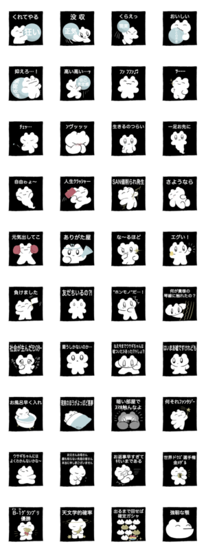 黒い背景のウサギちゃんスタンプです。正直言ってタイトルが思いつきませんでした。この素直さに免じて。皆さまよろしくお願いします。村ちゃんピッピ より発売