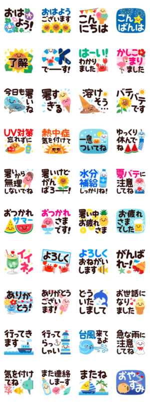 ちょっとだけ大人の、シンプルで見やすいデカ文字スタンプ。夏に使えるほっこり便利なスタンプです♪みーすけ より発売