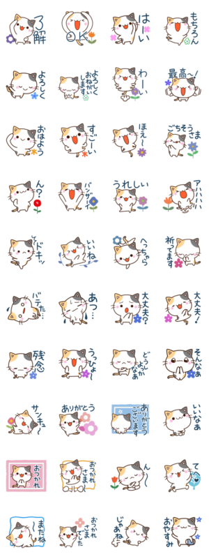 『ちびミケ』の【絵文字】と【着せかえ】もあります!ちいさい三毛猫の、すぐに返事ができるネコスタンプ。かわいい、みけねこ好きな方にぜひ。【かたこ】北欧風/ガーリーかたこ より発売