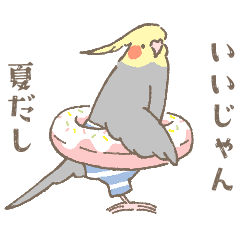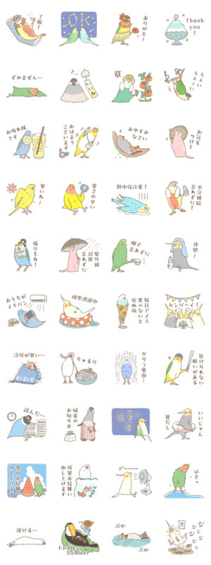 とりちゃんたちの夏なスタンプです。 コザクラインコ/セキセイインコ/オカメインコ/ウロコインコ/シロハラインコ/アキクサインコ/マメルリハ/文鳥/キンカチョウ/インコなみへい より発売