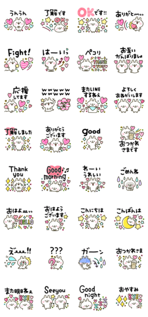 毎日使える♡超カラフルなうさぎの可愛いスタンプ♡ みんな使える無難な日常会話セットです。 かわいい/家族/カップル/大人可愛い/ポップ/ガーリー/デカ文字ちゃぴ より発売