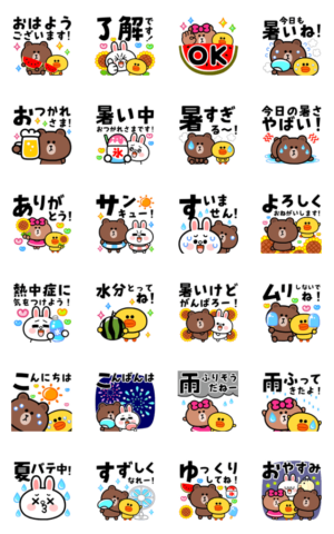 ブラウン&フレンズの飛び出す夏のスタンプ!夏の定番の挨拶と返事がそろってる♪でか文字だから見やすいよ~★楽しいスタンプで日本の夏を乗り切ろうね(^▽^)/