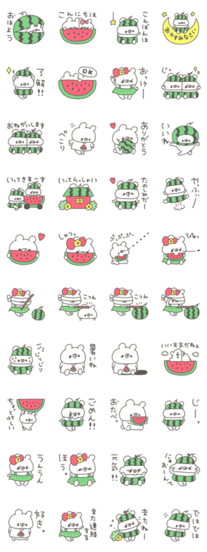 くまとスイカのちょっと変わったスタンプ。夏というよりスイカがかなり濃くフィーチャーされているので、スイカに関わりがあるなら季節関係なく使えそう。くまのキャラクターには独特のゆるさもある。