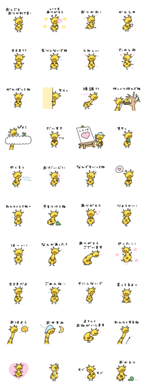 背が低くてもちもちしたキリンが印象的な作品。メッセージ自体は使いやすいものが多い。人によっては黄色いウシに見えるかも……