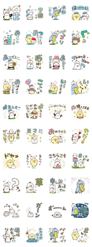 まるいやつらとトリさんの毎日使えるゆる~いスタンプです。大きめの文字で見やすい夏スタンプです。シマエナガ/スズメ/雀/すずめ/ハシビロコウ/ひよこ/ヒヨコ