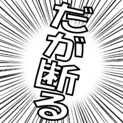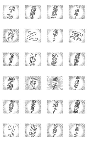 漫画のセリフのようなでか文字が画面一杯に飛び出して回転!マンガのような抜き文字とまんがのような集中線を使ったポップアップスタンプ。