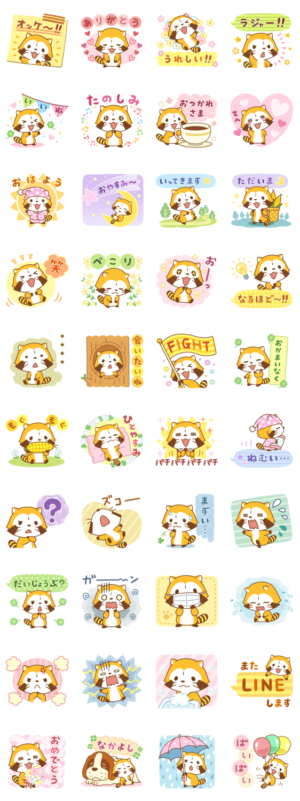 パステルカラーの背景とデフォルメされたラスカルが超カワイイ、ベーシックなスタンプパック!新生活にピッタリ☆毎日でも使える基本的なあいさつメッセージを収録♪
