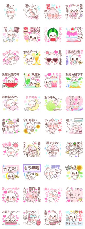 夏を彩るラインナップが素敵な可愛いスタンプです。とても明るくて気分が上がりますね。