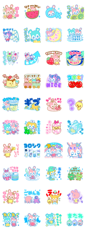 かわいいレトロアニマルうさもきゅたちの、元気いっぱいカラフルな夏スタンプです。デカ文字、挨拶多めで見やすく使いやすいスタンプになっています☆しらたまごはん より発売