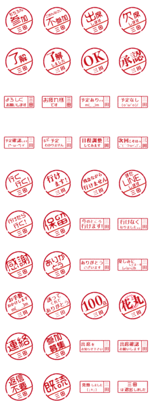 コミュニティ,TPOに合わせ敬語〜フランクな返事まで選べる名前入り判子※四角は省スペース.参加/不参加など返信を見やすく伝えてくれます<三田,みた,さんだ>