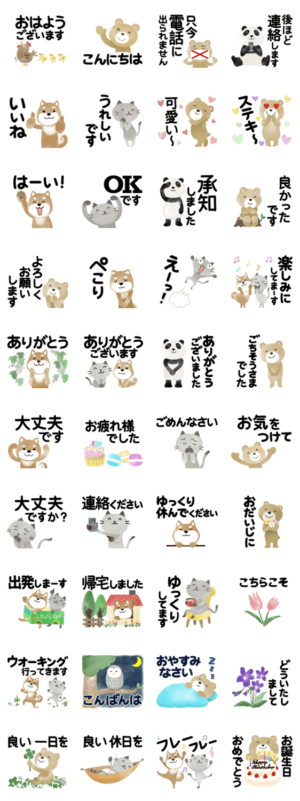 猫、犬、クマ、パンダの優しいスタンプです♪スマホデビューの方、シニアの方にも毎日便利に使っていただけると思います。