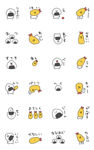 シュールなミニおにぎりとミニエビフライの動きまくるスタンプです。eribo より発売