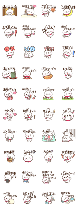 ちいさいウサギの毎日便利に使えるスタンプ。よく使う言葉と、あいさつがいっぱいの、かわいいスタンプです。しろいうさぎキャラ好きな方にぜひ。【かたこ】