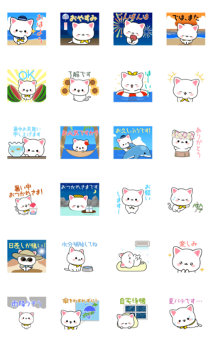 挨拶、お返事、夏の気遣いなど、夏に使えるかわいいしろにゃんこのスタンプです♪DECOR より発売