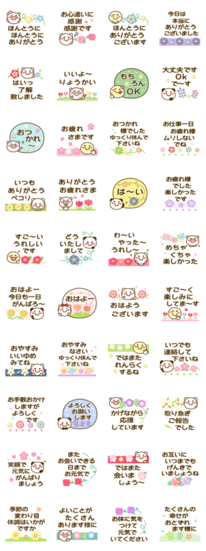 かわいい動物達の【もらってうれしい気持ちたっぷり】①花 長文スタンプです♪タメ語 敬語両方入りで、シンプルで誰にでも使えて便利!です。パンダ ねこ ぶた❤作:usakazu1