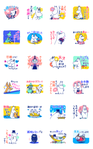 ムーミンのポップで色鮮やかな敬語スタンプが登場!少し大げさでコミカルな言い回しもムーミンたちにおまかせ♪いろんな場面で使える万能スタンプです。
