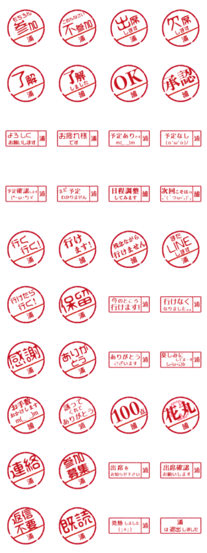 コミュニティ,TPOに合わせ敬語〜フランクな返事まで選べる名前入り判子※四角は省スペース.参加/不参加など返信を見やすく伝えてくれます<浦,うら,ほ>名前専用ルーク より発売