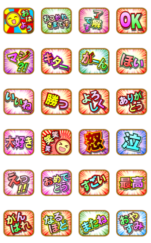画面上に飛び出す2枚のパネルが激しく交互にスライドするポップアップスタンプです、おはようからおやすみ、毎日使える日常会話を中心に激アツに伝えます