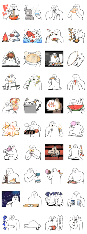 おいしそう(?)に食べ物を食べる人のスタンプ。顔面の圧が強い。使い所もちょっと難しいものが多いかも。個性的ではあるので、ハマればあるいは……