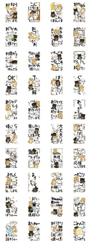 仲良しワンコたちのずーっと使える言葉のスタンプです。