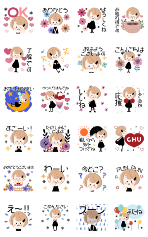 ガーリーな女の子のスタンプ。華やかながらも彩度は抑えてあり、大人らしさやフォーマルさも出ている。メッセージの汎用性も高く使いやすい。