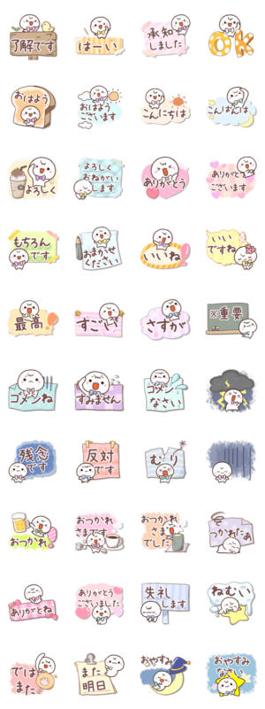 蝶ネクタイをした、ちいさくて可愛い『ちびコ』。しろくて、丸いチビキャラです。ずっと使える基本的な言葉のスタンプ。白くて、まるいキャラ好きな方にぜひ。【かたこ】