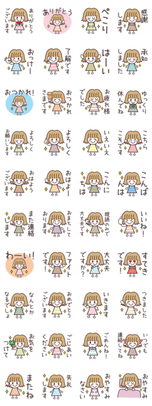 シンプルで大人かわいい、女の子のスタンプです。敬語とタメ語の両方入りです♪HRYs より発売