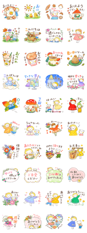 ほっこりする絵柄とカラフルな絵柄が素敵なスタンプです。優しい雰囲気で誰にでも送信しやすいです。