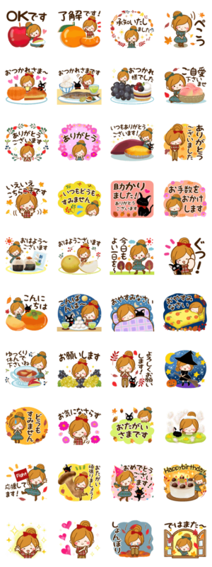 カラフルでおいしい秋の食べ物がいっぱい♡季節を感じるスタンプです♪敬語多めで使いやすくて日常におすすめ★ かわいい黒猫も一緒です♡ 「ほのぼのカノジョ」シリーズルルー より発売