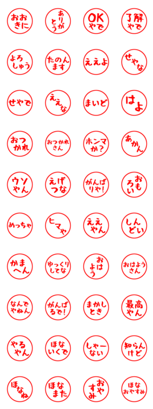 シンプルで見やすい、関西弁のハンコ風スタンプです。誰でも気軽に使いやすい内容となっています。HRYs より発売