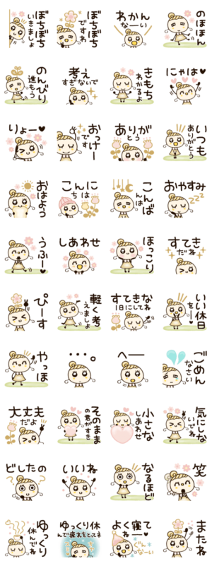 ほぺ美ちゃんシリーズ♪心が軽く穏やかになるような、ほんわかとしたスタンプです。小さな幸せ/感謝あさごぱん より発売