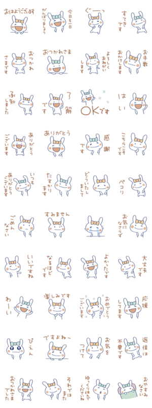 うさぎのうさラテ。「承知しました」「お気になさらず」から「感謝です」まで。うさラテで、丁寧にあいさつ言葉を届けよう。家族、学校、お仕事でも。Mami / エストループ より発売