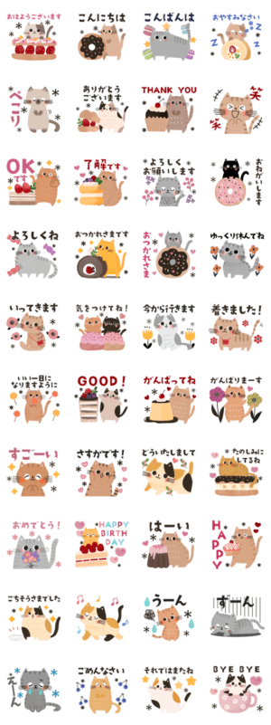 可愛い猫とお菓子のスタンプです!日常のあいさつやお祝いの言葉など。ありがとう/おつかれさま/おめでとう/了解/よろしくNAKAYUKA より発売