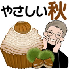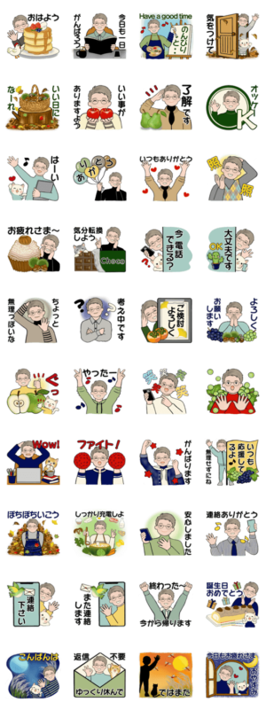秋の味覚を添えた季節を感じる男性用の日常スタンプです。やさしい秋を心地よく楽しんでください。