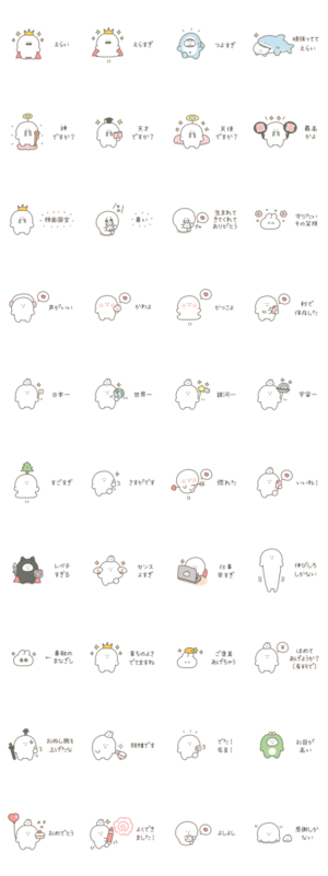 絶望ちゃんシリーズ褒める編。偉い/ポジティブ/太鼓持ち/最高/国宝/王様/ヒゲ髭/天才/神/天使/尊い/尊敬/名言/レベチ/推し/アイドル/声優/着ぐるみ/サメ/鮫/小さいスタンプ
