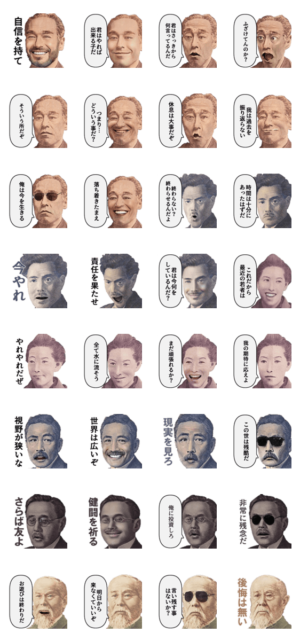 褒る、注意、励まし、ツッコミ等汎用性が高いスタンプです。親しい人にちょうど送りやすいテンションです。偉人/シュール/面白い/ネタ/