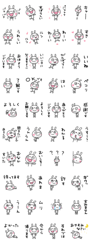 教科書か子供向けアニメにありそうな雰囲気のうさぎのスタンプ。多彩なメッセージがあり、使い所に困ることはなさそう。スタンプ数も多めで良い。